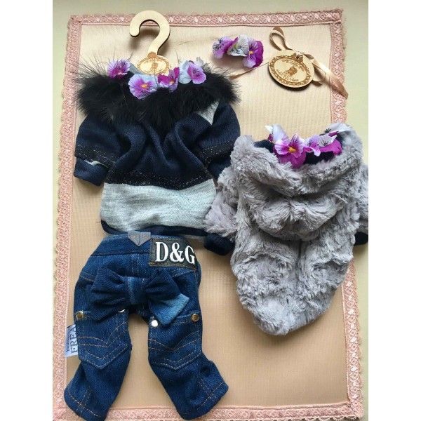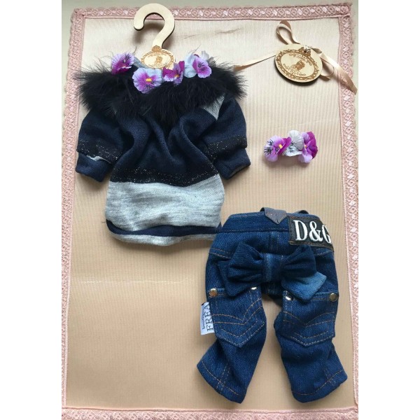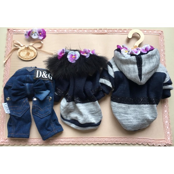 Дънки, пуловерче и двулицево топло якенце “My Yorkie Fashion Icon collection by FREA”